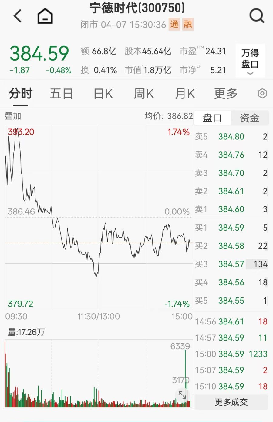 股价方面,宁德时代4月7日跌0.48%,收报384.59元/股,总市值为1.8万亿元;今年3月以来股价涨幅为12.45%。