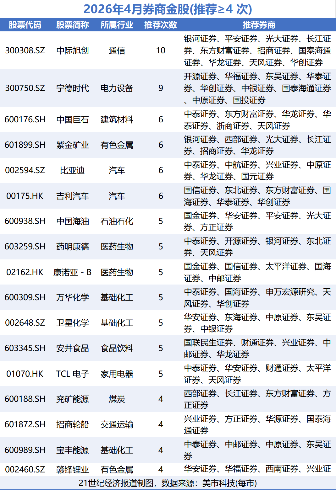 每市数据显示,中际旭创(300308.SZ)以10家券商推荐,位居榜首;紧随其后,宁德时代(300750.SZ)获9家券商联合推荐。