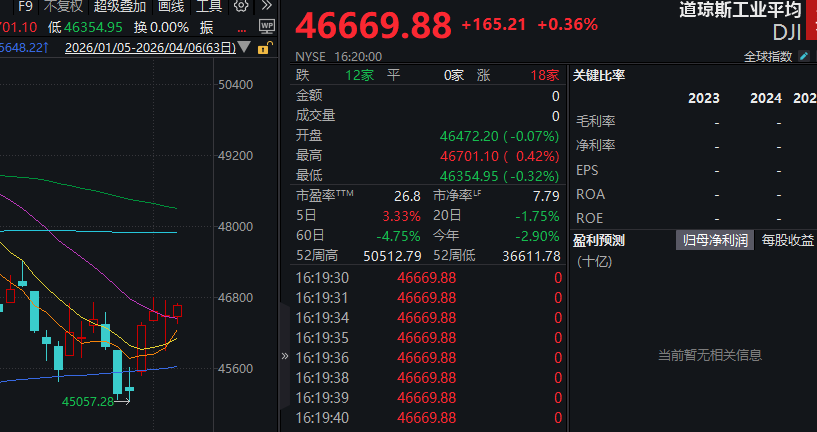 当地时间4月6日,美股三大指数集体收涨。截至收盘,道琼斯指数涨0.36%,报46669.88点;标普500指数涨0.44%,报6611.83点;纳斯达克指数涨0.54%,报21996.34点,三大股指均收4连阳。