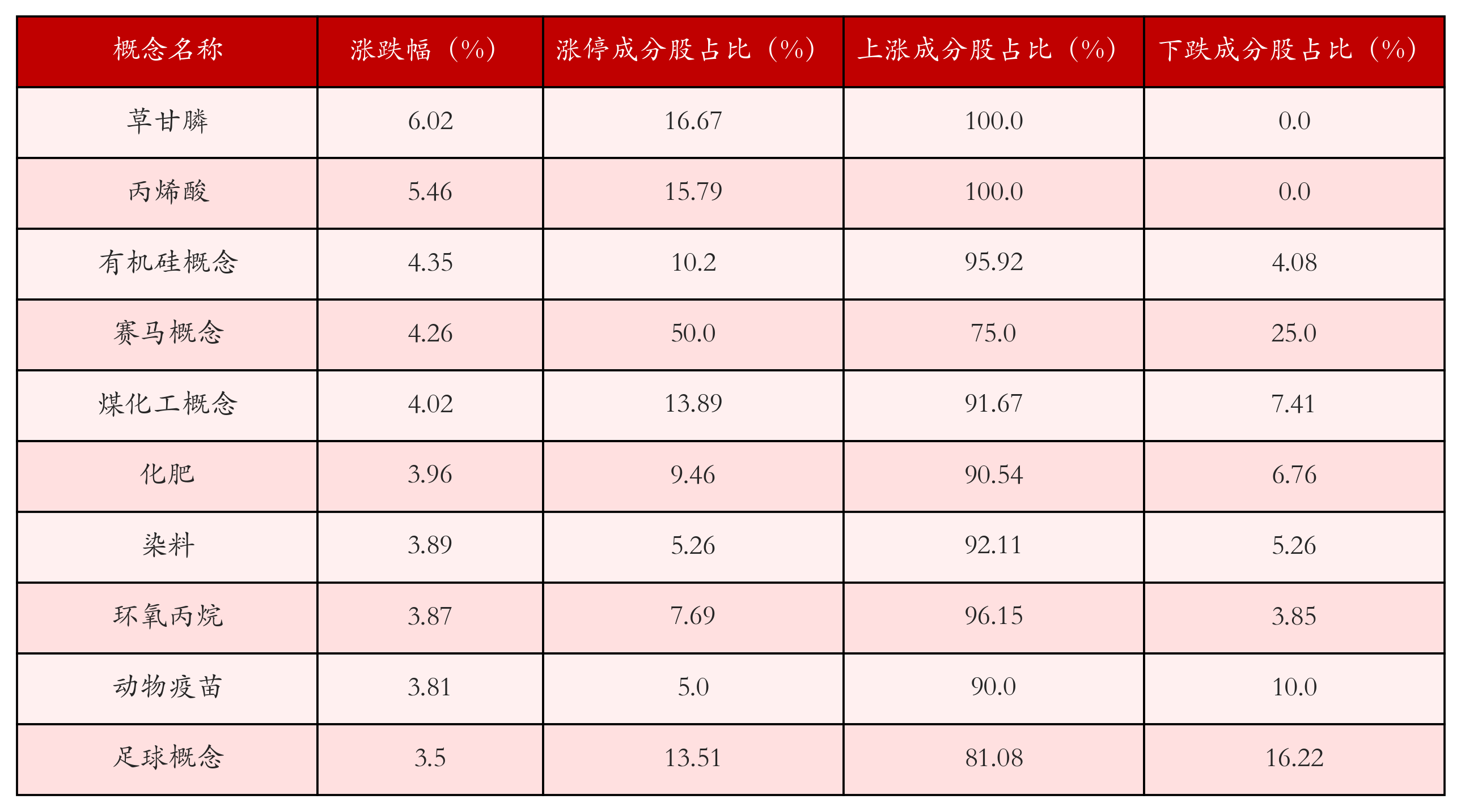 根据A股概念涨跌幅与所对应的股票池综合分析,涨幅靠前的三个概念板块分别为:草甘膦、丙烯酸与有机硅概念,均为化工概念。排名前10位的概念板块相关数据见下表: