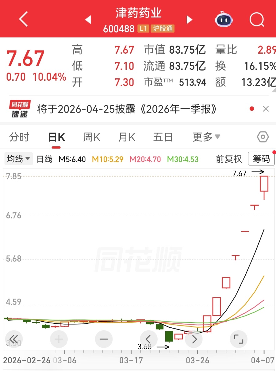 其中津药药业的股价异动尤为引发市场关注。该股连续10个交易日内(3月24日至4月7日)日收盘价格涨幅偏离值累计达到100%,3月26日至4月7日期间,公司股票连续七个交易日涨停,期间股票价格累计涨幅93.69%。截至4月7日收盘,每股报价7.67元,市值约83.75亿元。