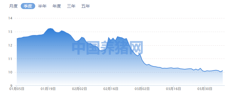 中国养猪网数据显示,4月以来,国内生猪(外三元)最低价10.03元/公斤,3月末低点为10.06元/公斤,同期生猪(内三元)最低价为9.95元/公斤,3月末低点为10.03元/公斤。