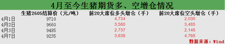 而截至4月7日收盘,生猪期货2607合约最新价为10.23元/公斤,明显高于2605合约9.21元/公斤的价格。这一多达1元/公斤的价格差,也为后续空头发力提供了更大的发挥空间。