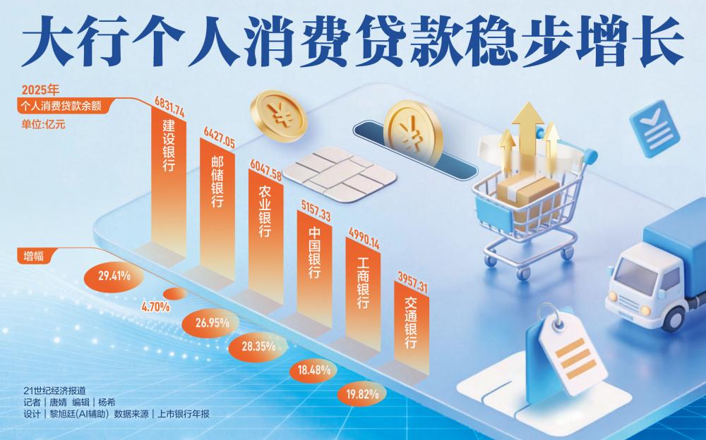 可以看出,建设银行消费贷的同比增速和余额规模均位列六大行第一。对此,建设银行副行长唐朔在2025年度业绩发布会上表示,在金融助力提振消费方面,建行主要做了三方面工作:一是积极加强商务和金融协作,协同开展促消费活动;二是主动作为,落实好财政金融协同促内需一揽子政策;三是聚焦消费重点领域,加大金融支持和创新力度。