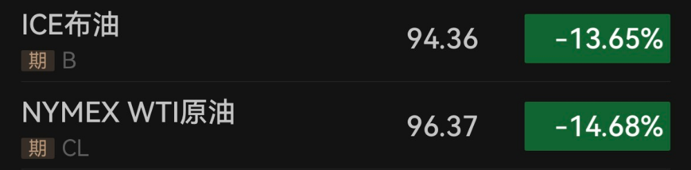 伴随股市大涨,国际油价、贵金属价格也出现大幅波动。国际市场原油价格“高台跳水”,截至8日13:00,WTI原油期货盘中一度跌幅超过19%,跌破每桶100美元关口,达91.05美元/桶。布伦特原油期货一度跌超16%,达最低91.7美元/桶。