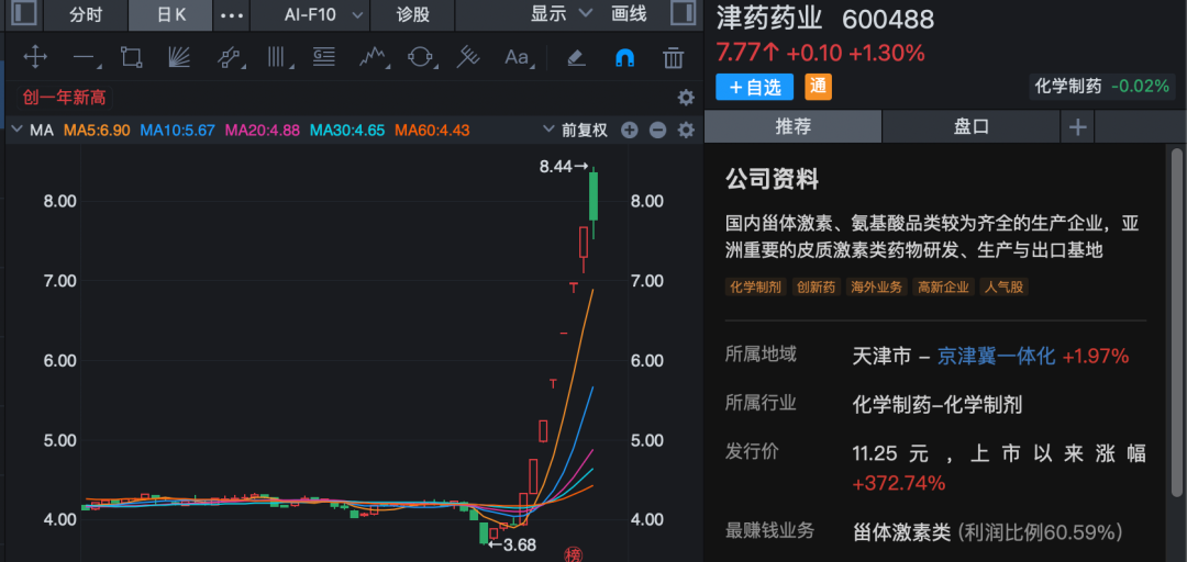 4月7日,津药药业公告,公司股票连续10个交易日内(2026年3月24日至2026年4月7日)日收盘价格涨幅偏离值累计达到100%,根据《上海证券交易所交易规则》的有关规定,属于股票交易严重异常波动情形。 津药药业称,公司关注到市场将公司列为创新药概念并进行炒作,公司目前研发以仿制药为主,无在研创新药项目,相关炒作存在明显误读。公司主营业务为甾体激素类、氨基酸类原料药及制剂的研发、生产和销售。同时,公司关注到市场对激素原料药产品价格的讨论,目前公司甾体激素原料药价格总体保持平稳,对公司经营业绩无影响。