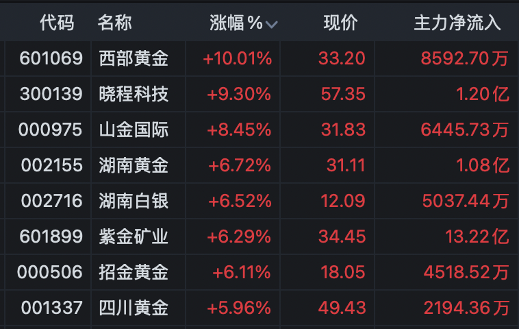 黄金股爆发 盘初,贵金属概念股集体走强,黄金股大涨。 西部黄金涨停,山金国际、湖南黄金、紫金矿业、招金黄金、四川黄金等多股涨超5%。消息面上,今天早盘,金银价格拉升,现货黄金一度站上4850美元/盎司,日内涨逾3%。