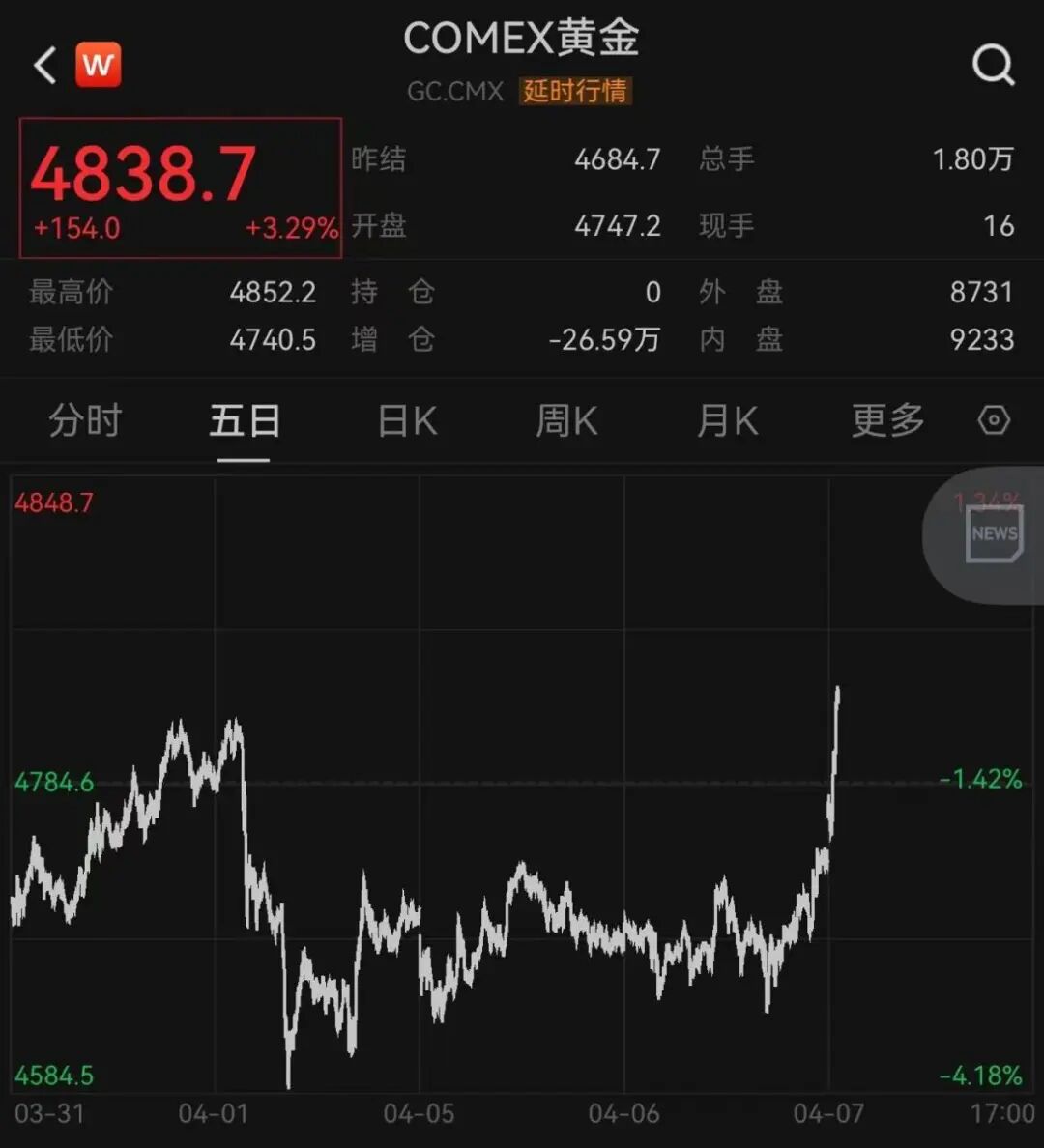 黄金上涨,COMEX黄金期货最新突破4800美元/盎司。