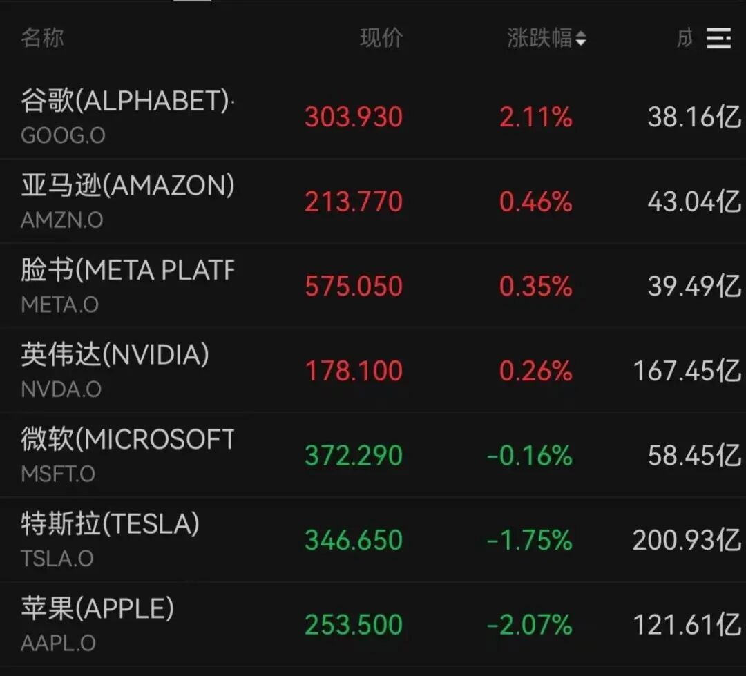 美股科技“七巨头”涨跌不一。谷歌、亚马逊、脸书、英伟达均收涨;苹果下跌超2%,特斯拉下跌1.75%,微软下跌0.16%。