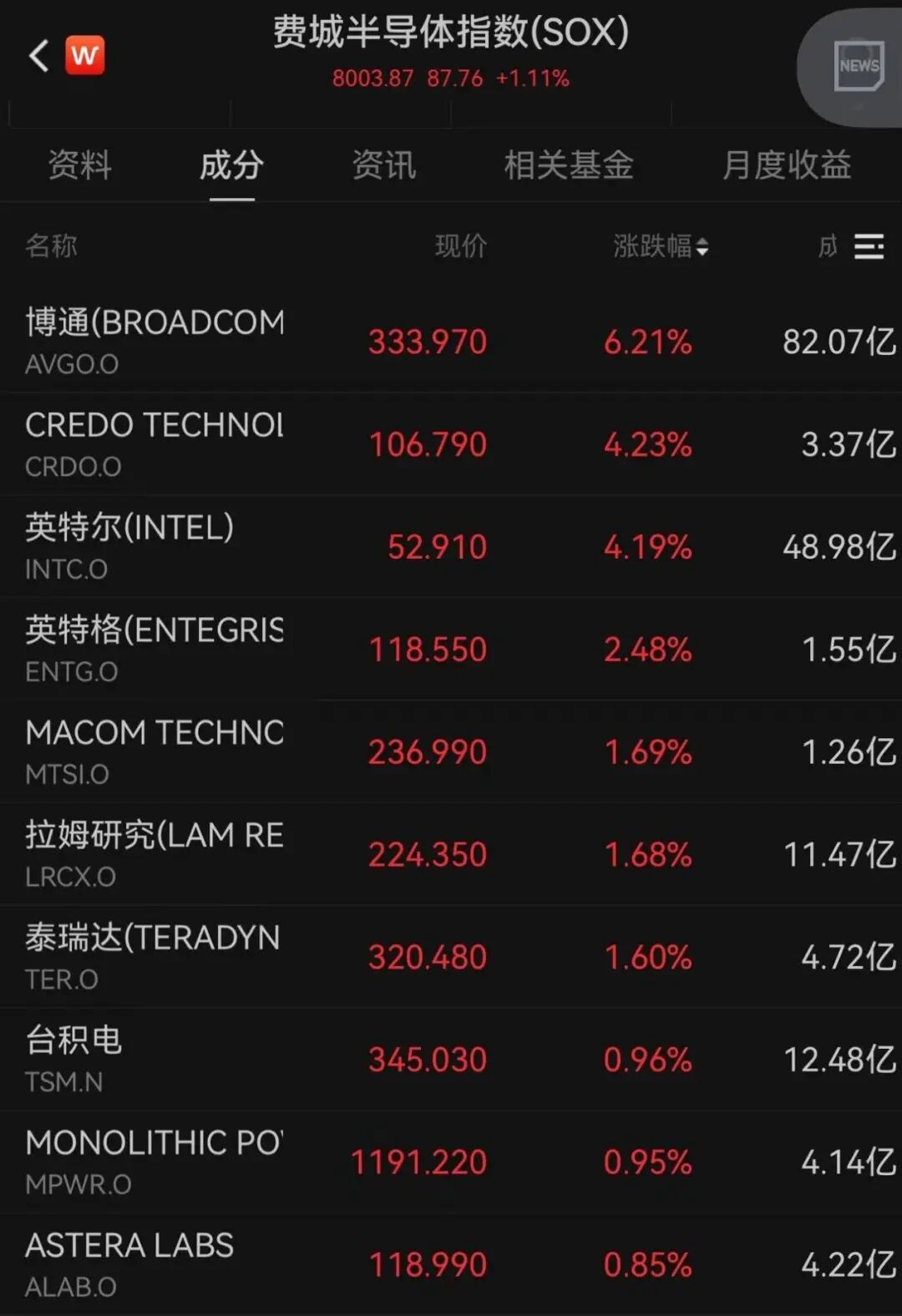 费城半导体指数上涨1.11%。博通涨超6%,英特尔涨超4%。