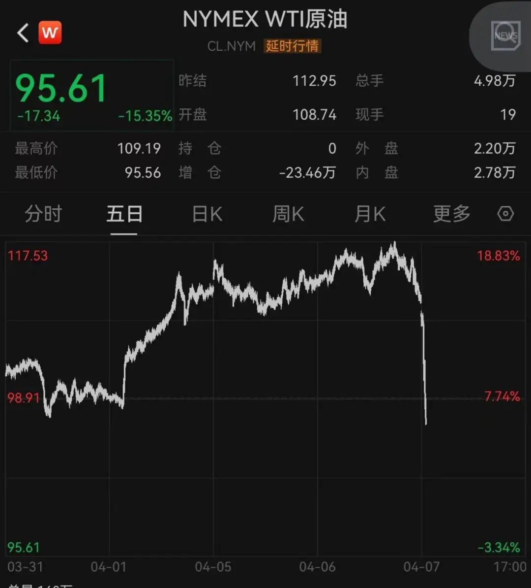 受上述特朗普“停火消息”影响,北京时间4月8日清晨,原油直线跳水。截至发稿,NYMEX WTI原油价格跌超15%。