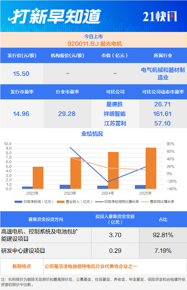 晨光电机成立于2001年,专业从事微特电机的研发、生产和销售,产品主要应用于以吸尘器为主的清洁电器领域。除清洁电器领域外,公司产品也应用于电动工具及其他领域。另据公开报道,晨光电机还是2026年A股首家过会企业。
