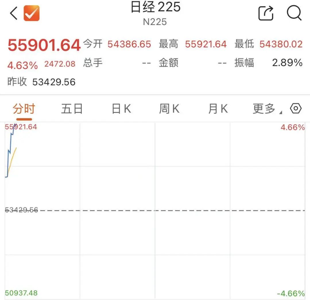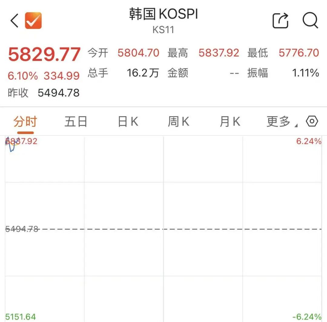 日经225指数开盘后直线拉升,截至发稿,涨幅扩大至涨4.6%,最新报55901.64点。 韩国综合指数(KOSPI)上涨超6%, 韩国交易所于KOSPI 200期货上涨5%后启动KOSPI指数熔断机制,程序化交易暂停5分钟。