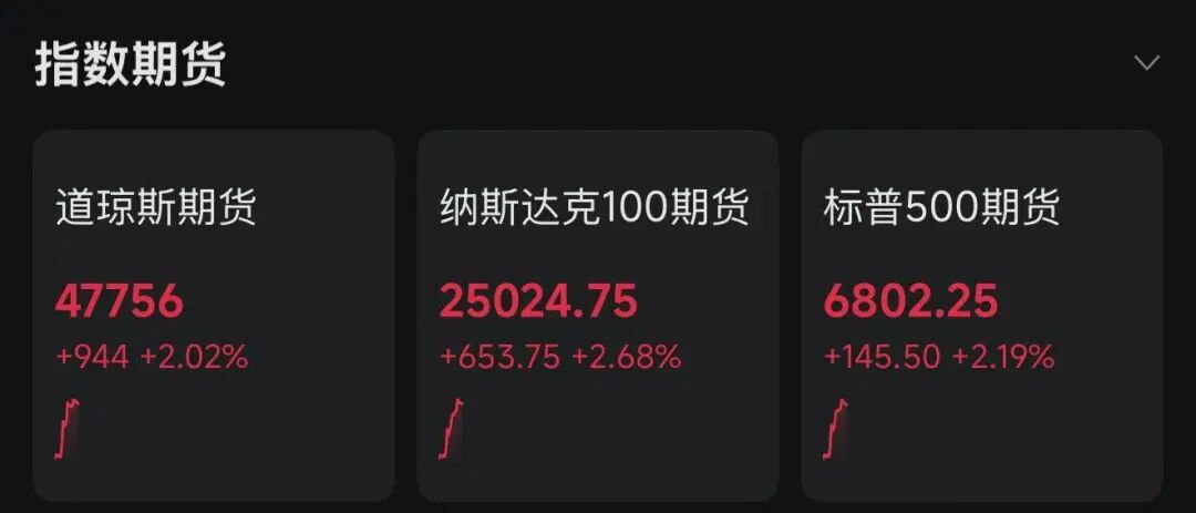 美股市场也迎来久违上涨行情。美股三大指数期货开盘后一路走高,截至发稿,涨幅均超过2%。