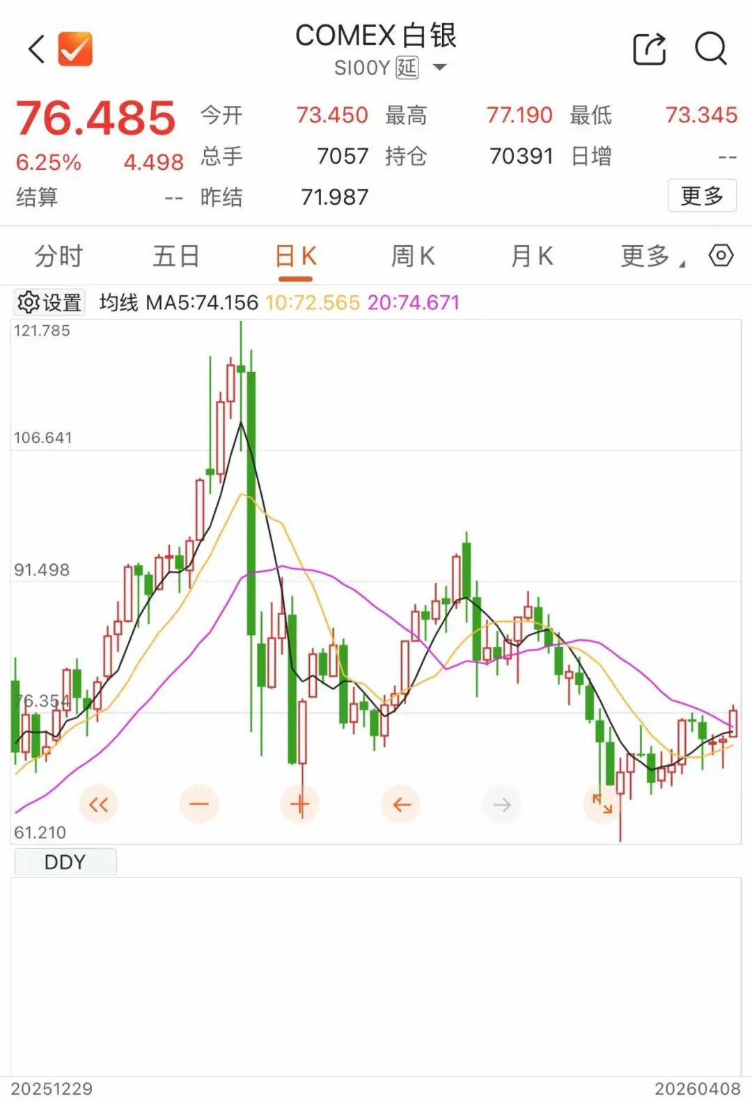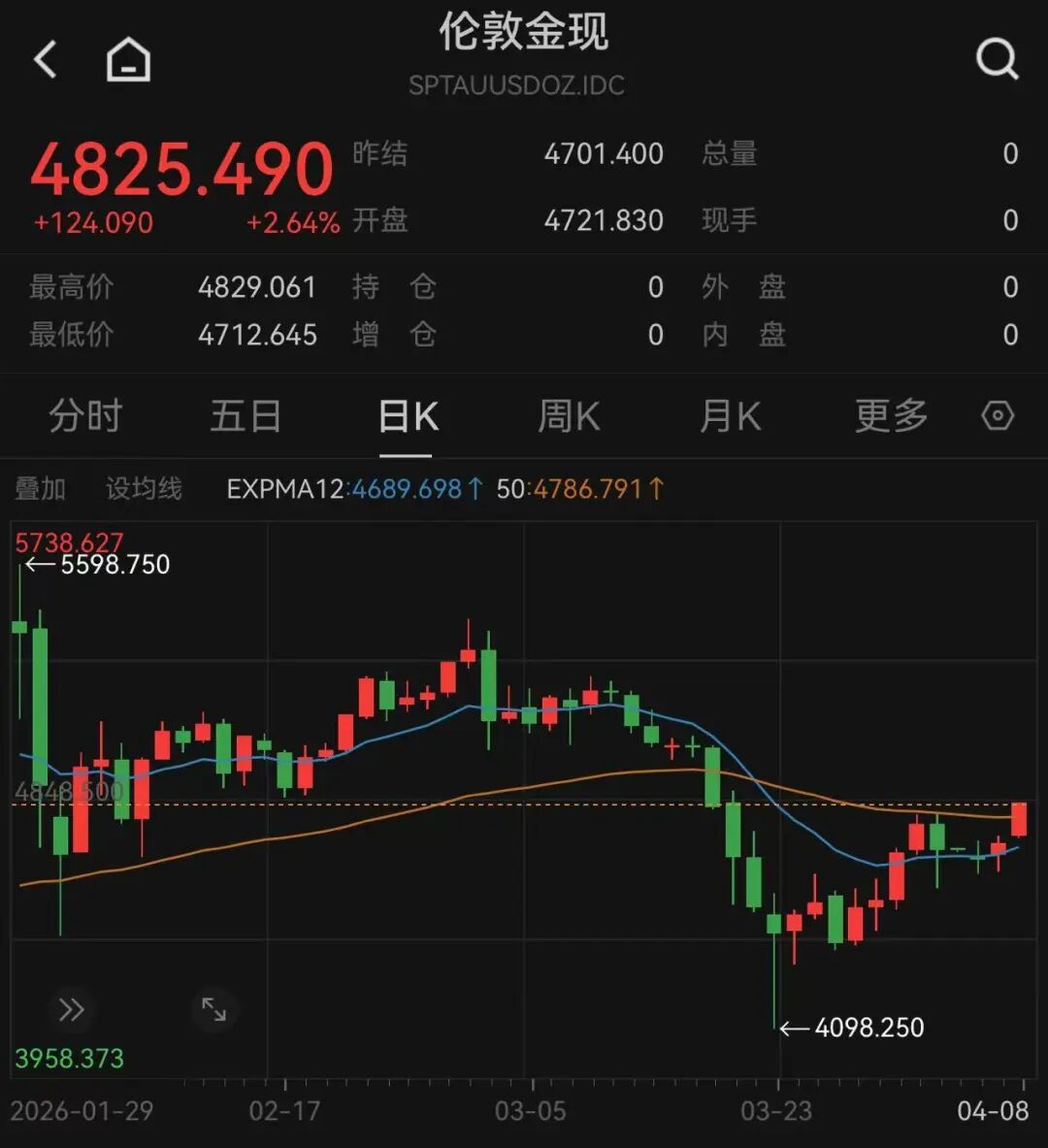 北京时间4月8日,国际金银价格开盘后直线拉升。伦敦现货黄金日内涨幅超过2%,盘中逼近4830美元/盎司;伦敦现货白银最高涨逾5%,最高价升破77美元/盎司。