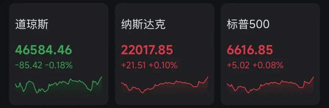 隔夜,美股市场三大指数涨跌不一,其中纳指和标普500指数录得四连涨。截至收盘,道指跌85.42点,跌幅0.18%,报46584.46点;纳指涨21.51点,涨幅0.10%,报22017.85点;标普500指数涨5.02点,涨幅0.08%,报6616.85点。