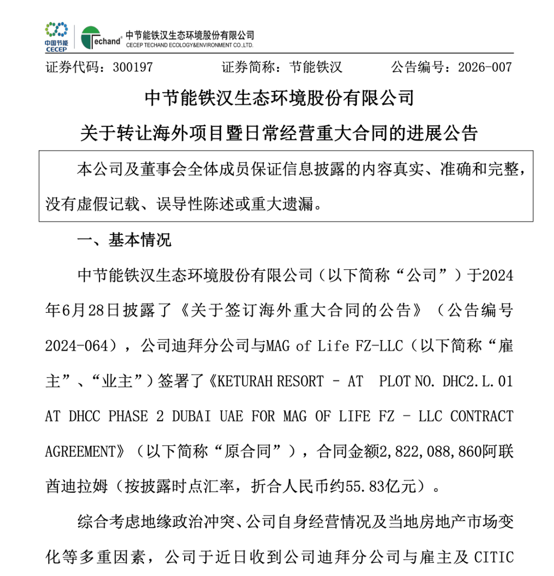 2026年4月,这个海外项目却突然易手。节能铁汉宣布,中信建设阿联酋公司取代公司迪拜分公司成为原合同项下的主承包商。节能铁汉解释称,此举主要考虑了地缘政治冲突、公司自身经营情况及当地房地产市场变化等多重因素。