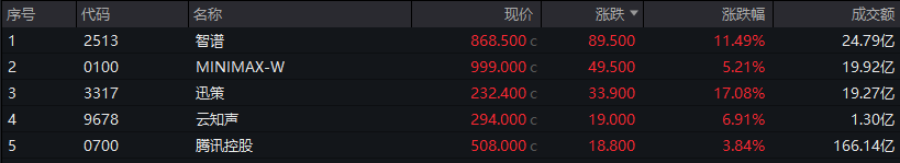 AI应用概念多股走高,智谱涨超11%,MINIMAX-W涨超5%。