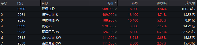 权重科技股普涨,美团涨超10%,阿里巴巴涨近7%,腾讯控股涨近4%。