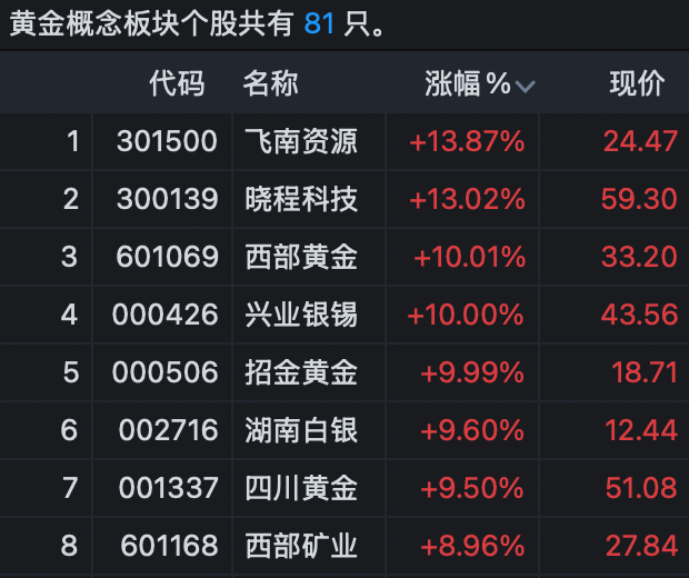 黄金概念股走强 贵金属概念股早间集体高开走强,板块指数放量飙升逾7%,开盘不到半小时成交就超过昨日全天成交。西部黄金一字涨停,飞南资源、晓程科技、兴业银锡等涨停或涨超10%。