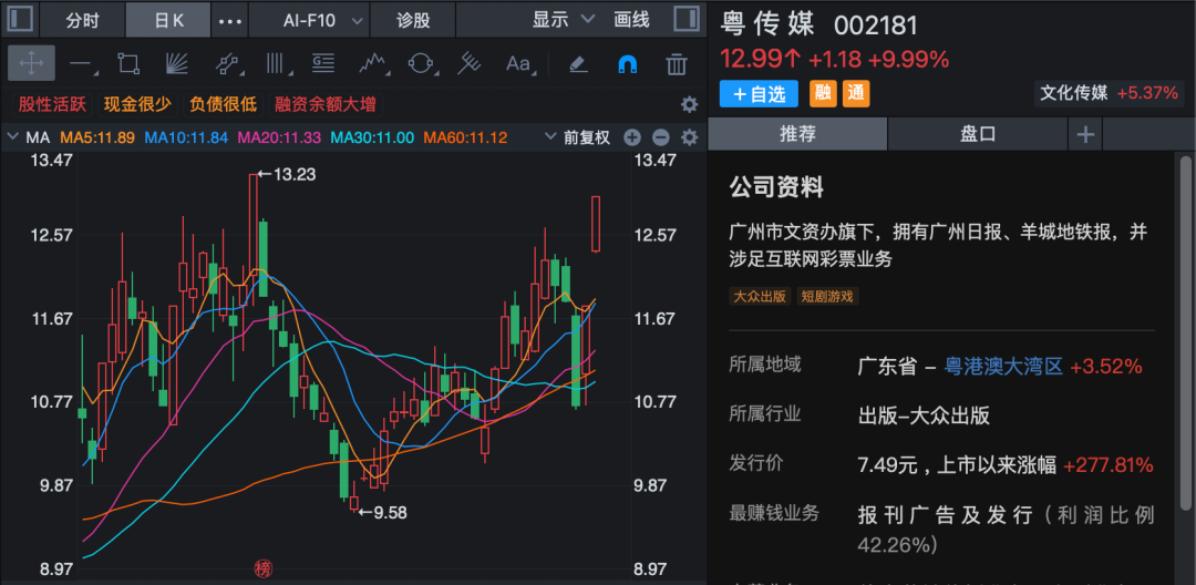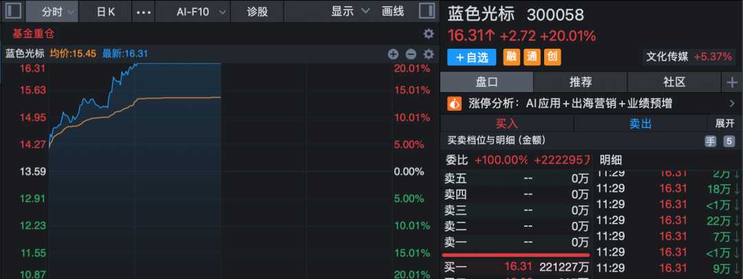 人工智能迎政策利好 人工智能概念全线大涨,AI营销方向领涨,板块指数单边上扬逾7%,不到1小时成交超昨日全天成交。蓝色光标(300058)20%涨停,粤传媒开盘仅约1分钟垂直涨停,连续第2日封板,引力传媒、利欧股份等逾10股涨停或涨超10%。