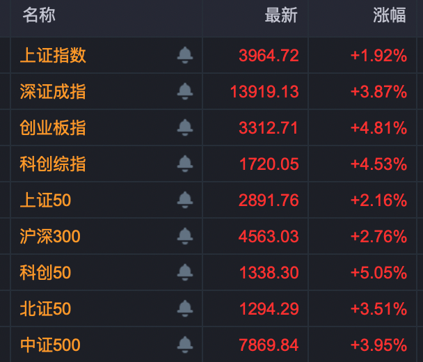 今日早盘,A股大幅高开高走,创业板指、科创综指均大涨超4%,深证成指、北证50也涨超3%,上证指数收复3900点。超5000只个股上涨,成交呈快速放大趋势。