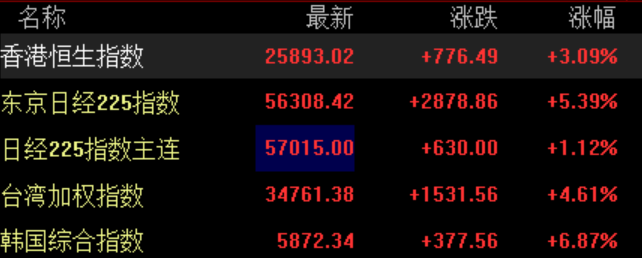 日韩股市均涨超5%、欧美股指期货走强。其中,韩国交易所KOSPI 200期货上涨5%后启动KOSPI指数熔断机制,程序化交易暂停5分钟。