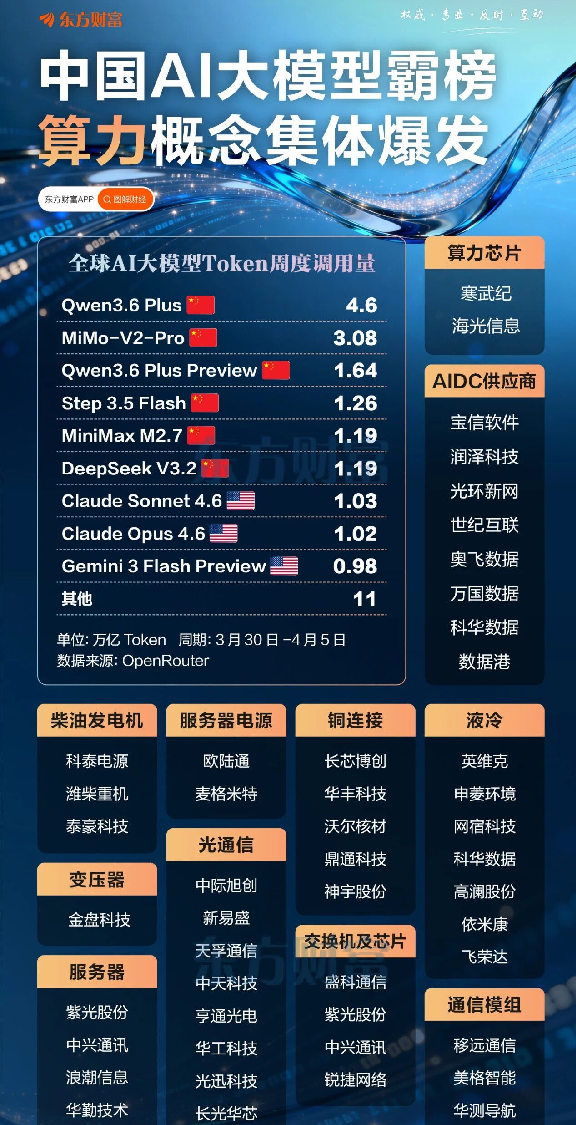 三是,据OpenRouter平台数据显示,上周(3月30日-4月5日),中国AI大模型周调用量达12.96万亿Token,较前一周增长31.48%,而美国仅为3.03万亿Token,环比增长仅0.76%,差距持续扩大。