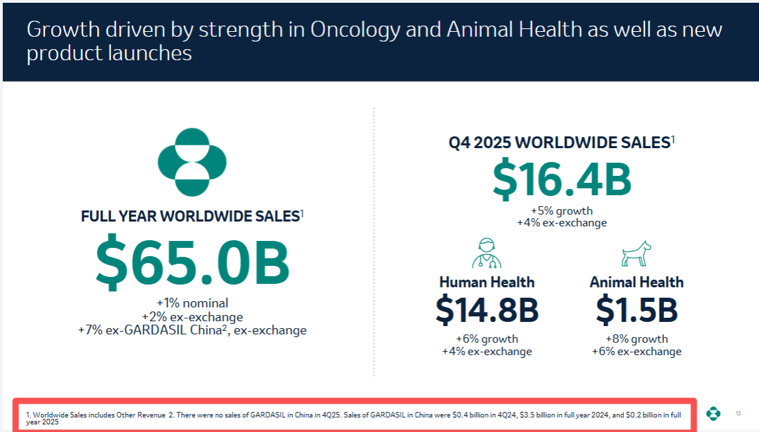 经营压力最终传导至业绩端。默沙东的财报显示,2025年,HPV疫苗在中国的销售额为2亿美元,与2024年的35亿美元相比,同比下降近95%。默沙东也预计,2026年中国市场的佳达修系列产品销量也不会有显著增长。