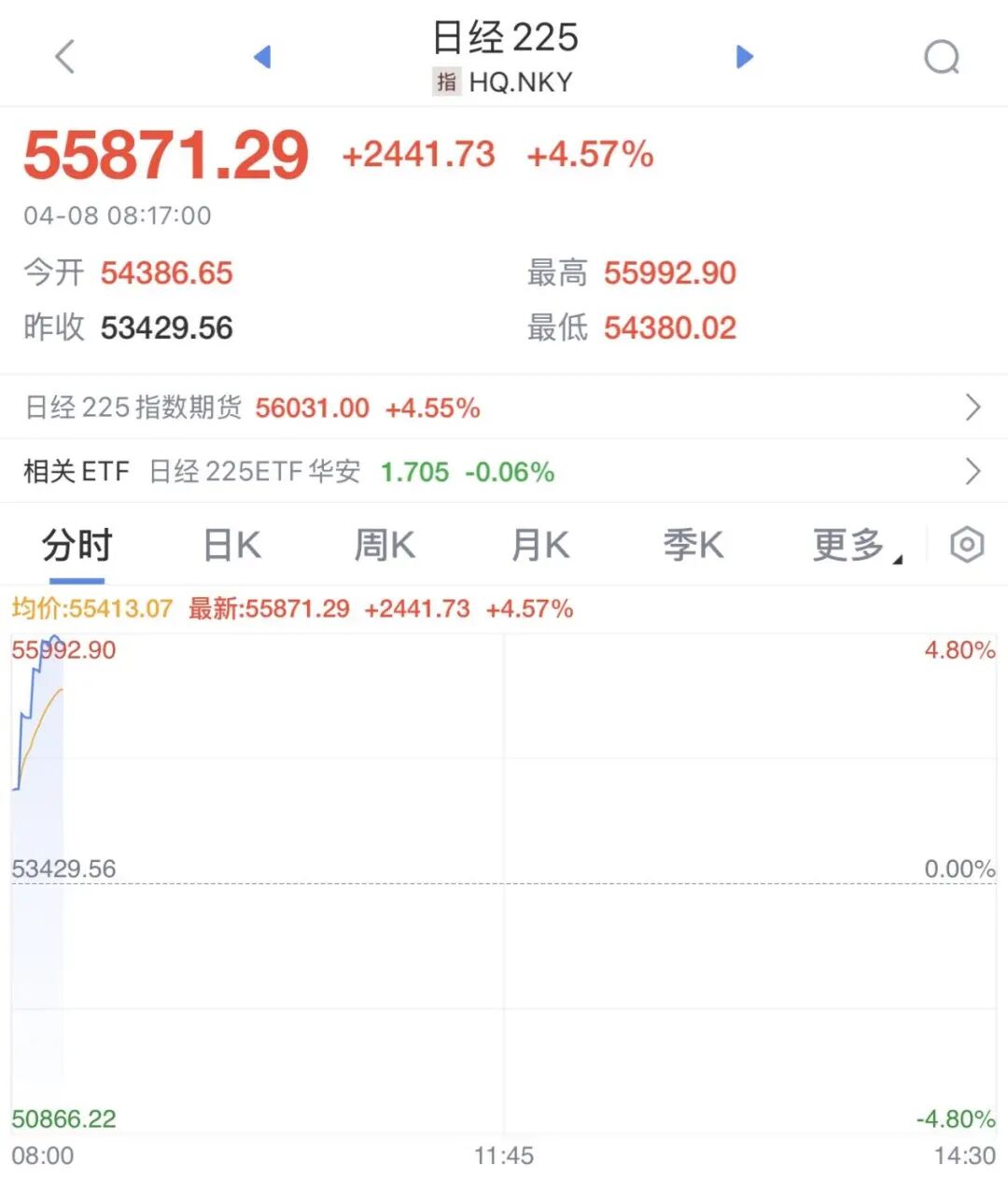 日本 股市高开后 涨幅进一步扩大,日经225指数最新上涨4. 57 %,报5 5871.29 点。