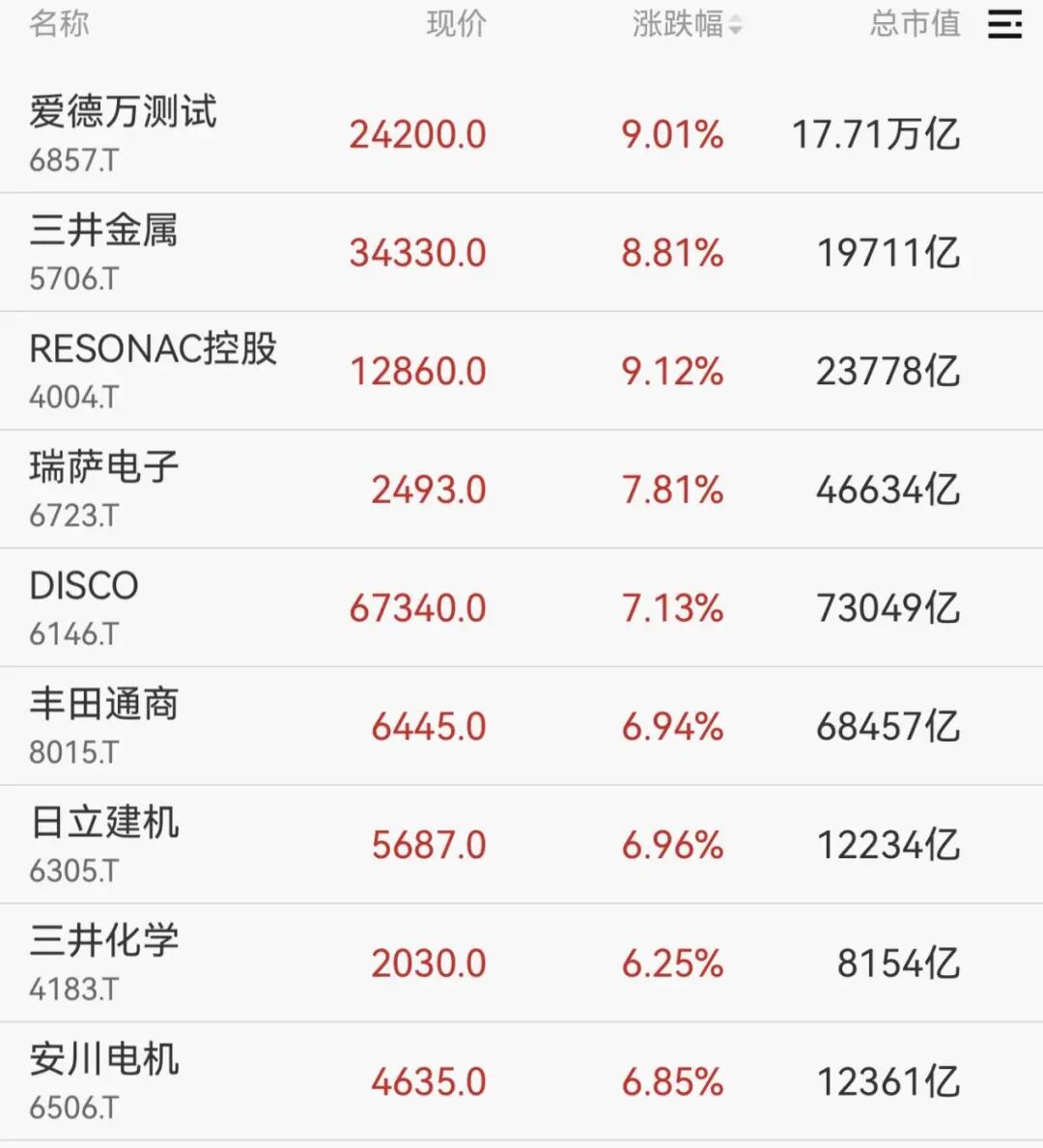 个股方面, 爱德万测试大涨超9%, 软银集团股价涨 超 6%。 受国际原油价格暴跌的影响, 日本国际石油开发帝石(INPEX)股价跌 超 7%。