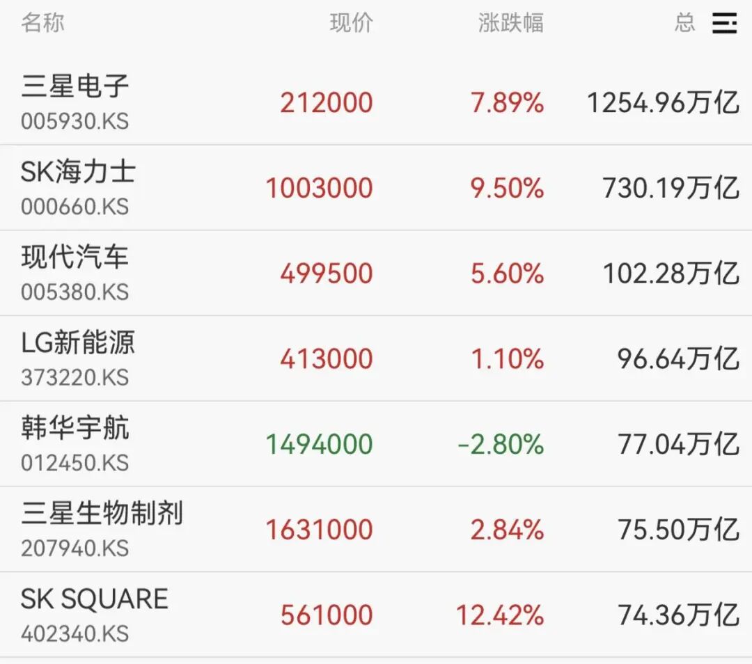 个股方面, 因财报利好消息提振,三星电子股价上涨 近 8%;SK海力士股价涨 超 9%。