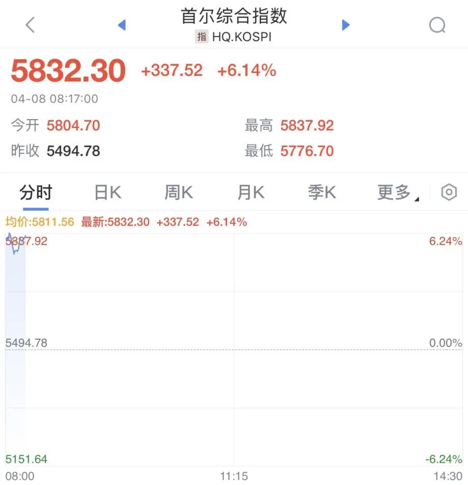 其中, 韩国综合指数 大 涨超 6 %,最新报5 832.3 点。
