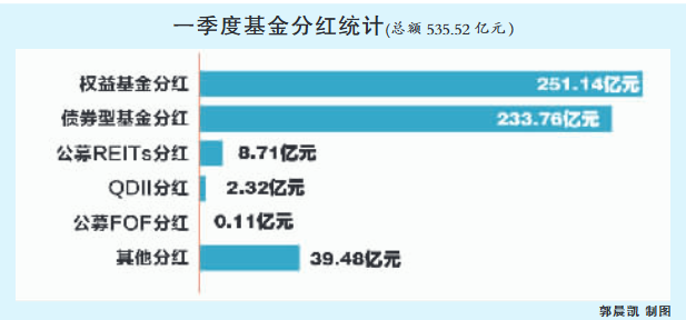 震荡的行情并没有影响基金大手笔分红。统计数据显示,截至3月31日,一季度共有1326只基金进行了分红,分红总额达535.52亿元,权益基金替代债券基金成为分红主力。