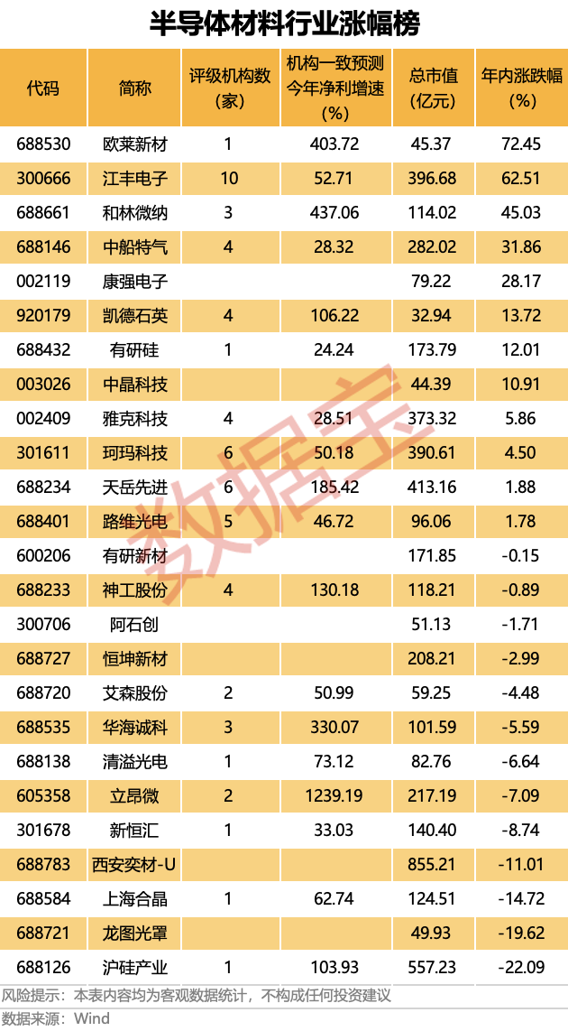 据证券时报·数据宝统计,A股市场上半导体材料行业共有25股。其中,机构一致预测 立昂微 2026年净利增速超12倍居首。