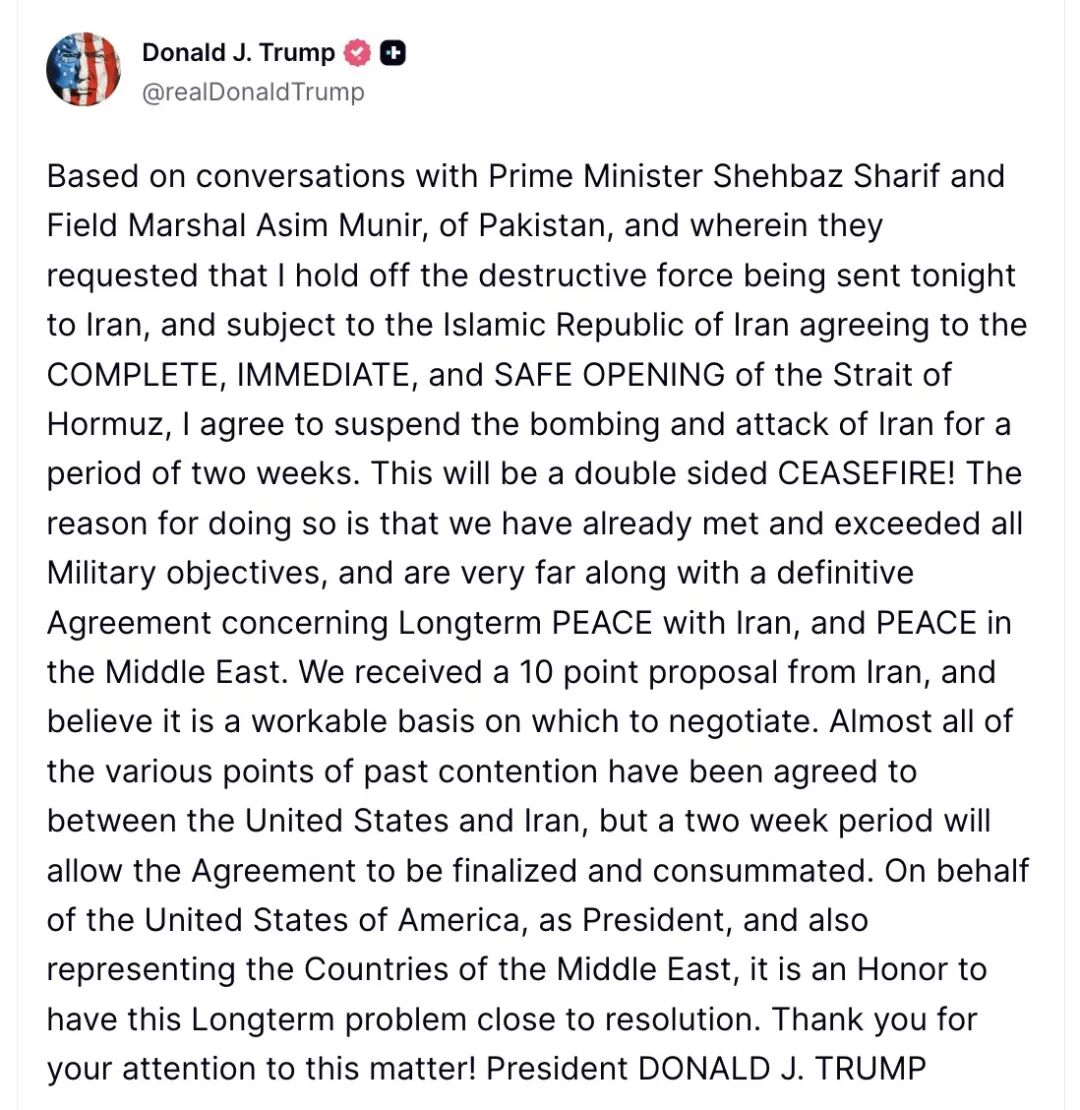 “我同意暂停对伊朗的轰炸和攻击,为期两周。” 当地时间4月7日傍晚,美国总统特朗普在社交媒体发文,让全世界松了一口气。