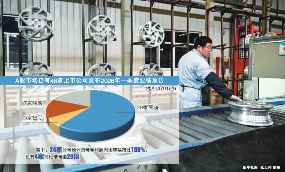 截至4月7日19时,A股市场已有48家上市公司发布2026年一季度业绩预告。数据显示,29家公司业绩预增,3家扭亏,7家略增,预喜比例达81.25%。其中,24家公司预计归母净利润同比增幅超过100%,更有4家同比增幅逾20倍。