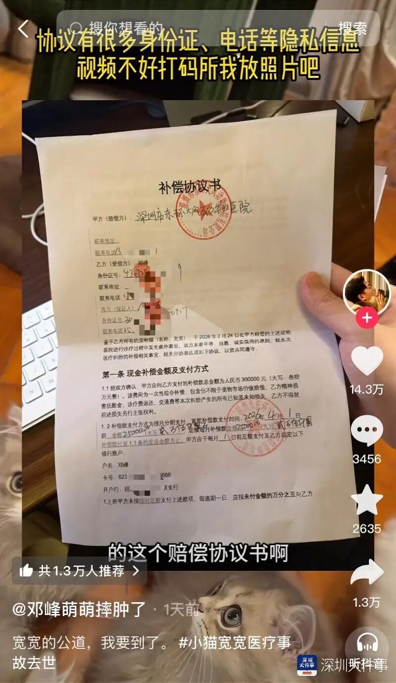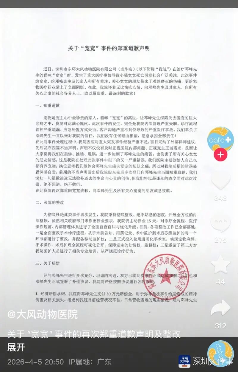 南都此前曾报道,今年3月初,网红小猫宽宽的主人“邓峰萌萌摔肿了”在社交网络发布视频称仅5月大的小猫宽宽已离世,原因系宠物医院诊疗过程中操作不当,导致猫在麻醉过程中出现呼吸、心跳骤停死亡。近日,涉事宠物医院发布声明称,已与宠主达成和解,赔偿30万现金,并将投入1100例流浪猫绝育公益计划。