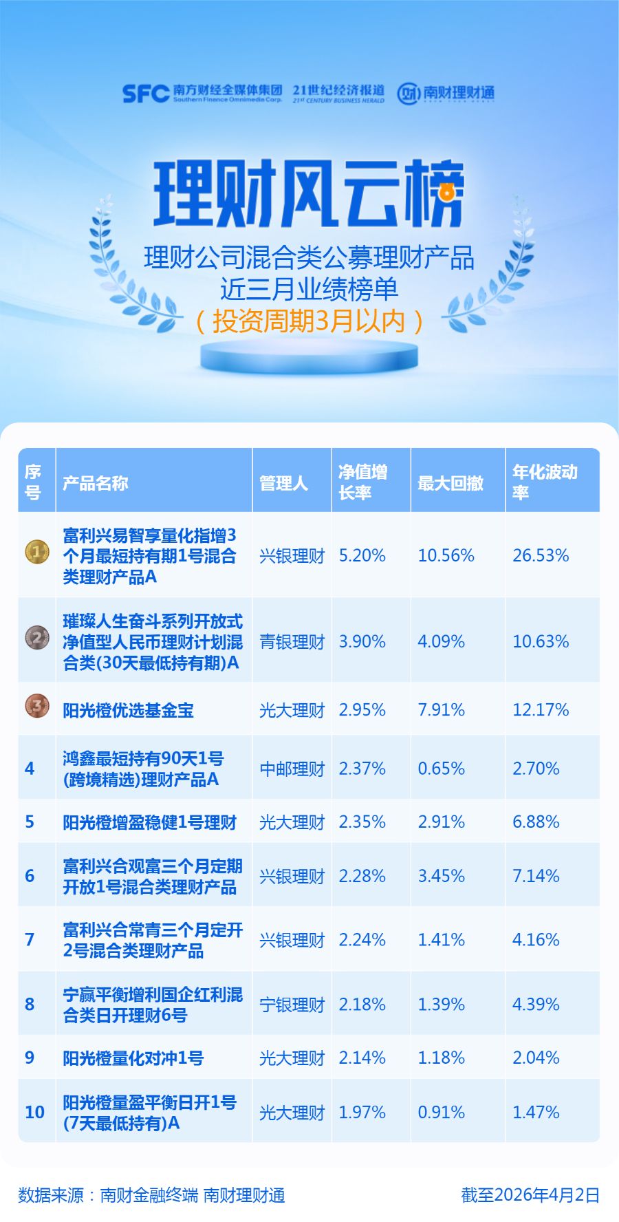 产品统计范围为理财公司3月以内期限的混合类公募理财,产品统计截止日期为2026年4月2日,统计区间为近三个月。