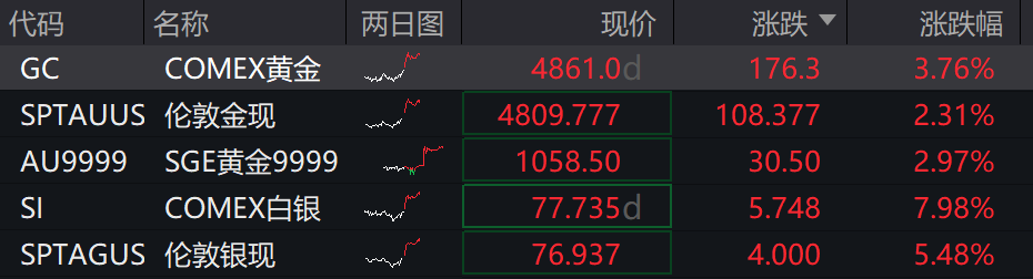 白银表现更为抢眼,伦敦现货白银报每盎司76.9美元,日内涨幅超5%;纽约期银(COMEX 白银)报77.74美元/盎司,单日大涨7.98%。