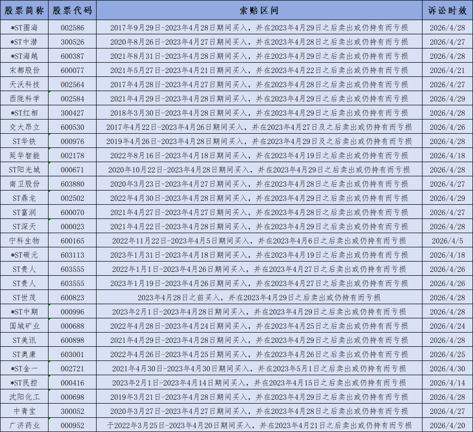 值得注意的是,名单中多只股票如*ST华铁、ST阳光城、中国中期等已经退市,但这并不影响投资者索赔。