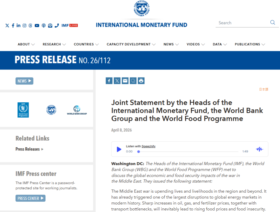 世界银行、国际货币基金组织(IMF)和联合国世界粮食计划署周三警告称, 中东战事引发的石油、天然气和化肥价格急剧上涨,将不可避免地导致食品价格上涨和粮食安全问题加剧 。