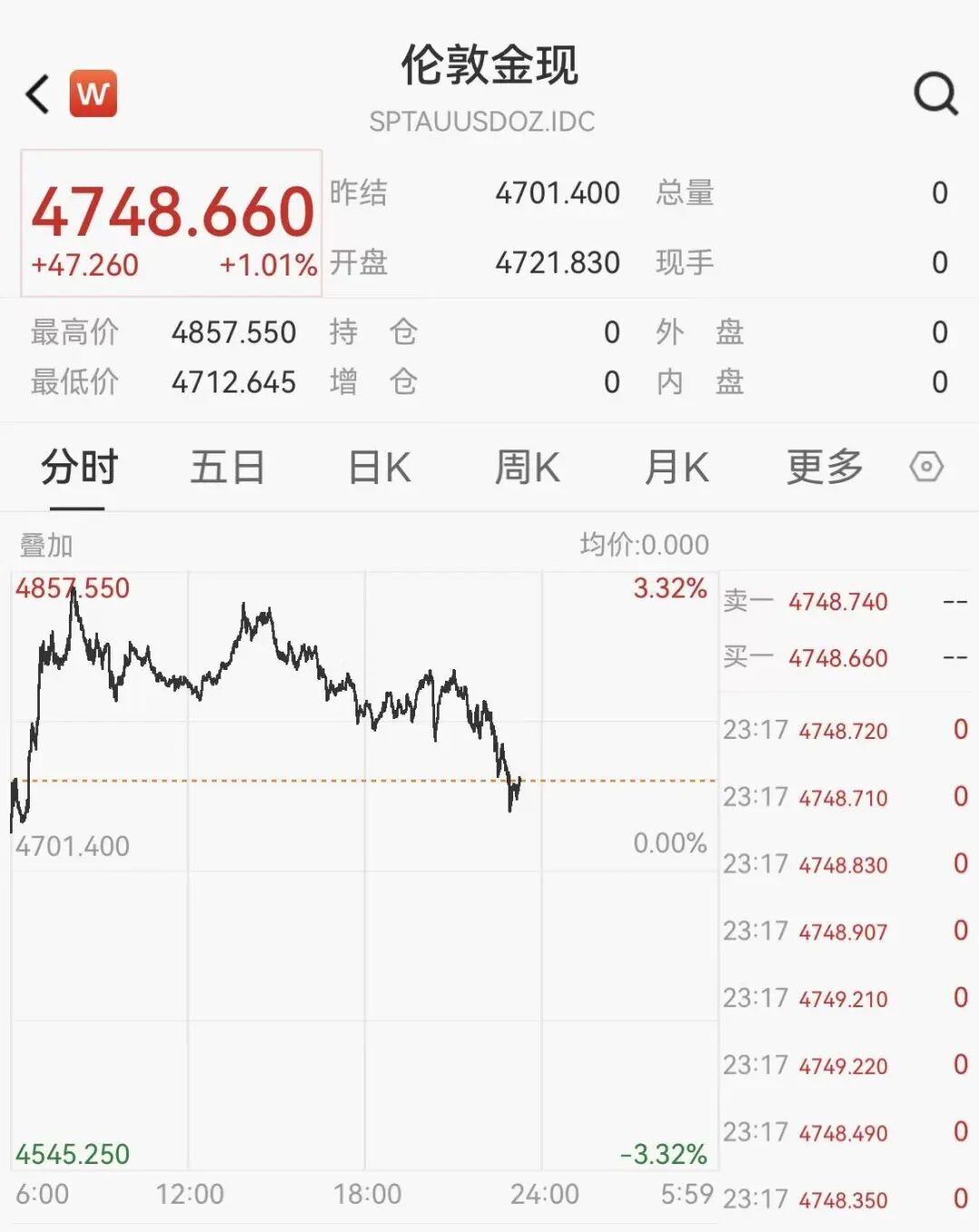 大宗商品方面,黄金白银短线下挫,现货黄金涨幅收窄至1%报4748美元/盎司,现货白银涨幅由5%收窄至3.5%,现报75.4美元/盎司。