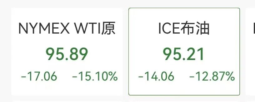 国际油价方面则短线拉升,美油、布油重新站上95美元/桶,此前美油一度重挫19%,跌至91美元/桶附近。