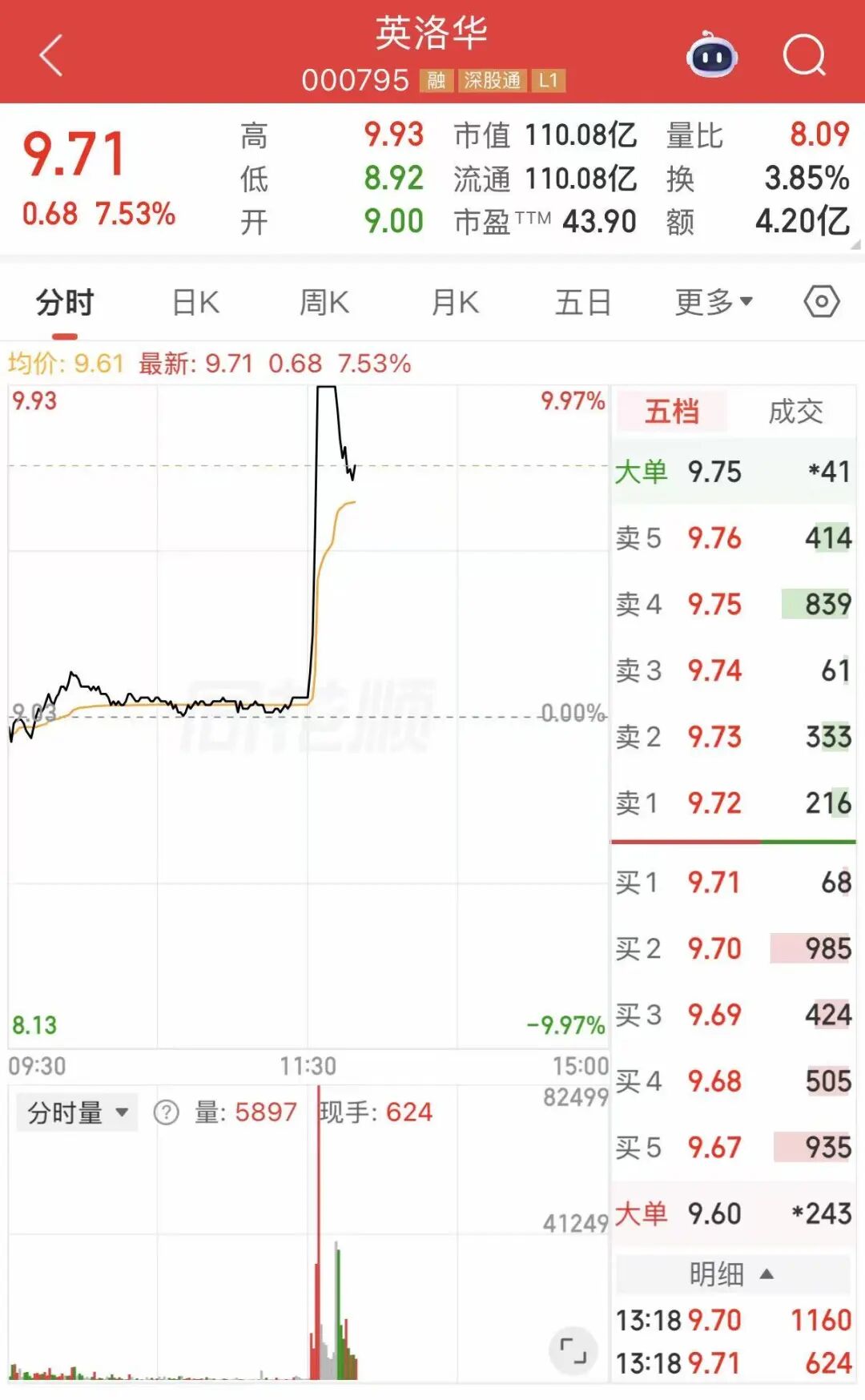 午后,稀土永磁板块拉升,英洛华(000795)直线涨停,随后开板回落,未能封死涨停。截至发稿,该股报9.71元,涨幅7.53%。华宏科技此前涨停,九菱科技、华新环保、新莱福、中稀有色、中科磁业跟涨。
