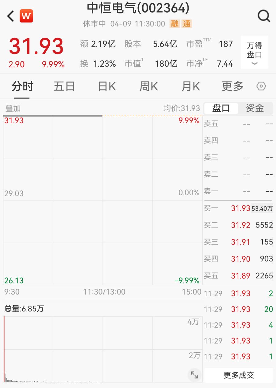 4月9日,中恒电气(002364.SZ)一字涨停,报31.93元/股,总市值为179.9亿元。