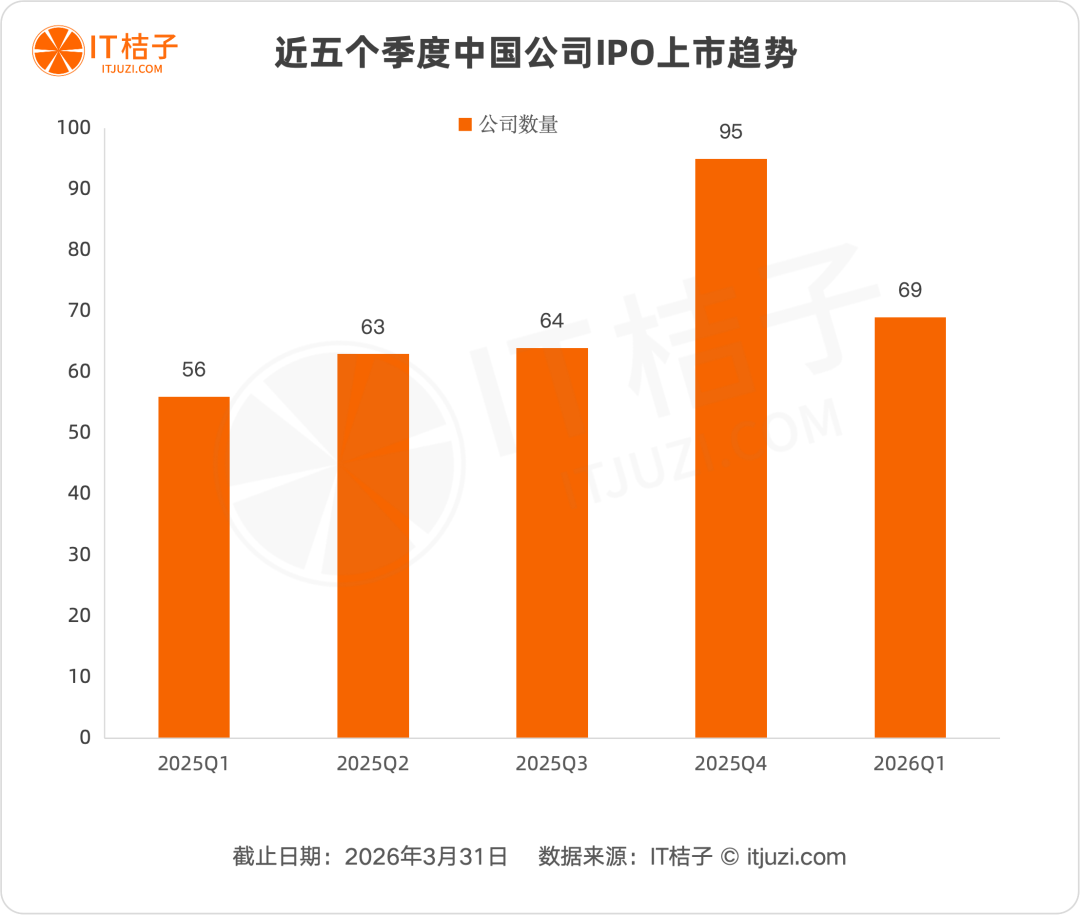 季度内69家企业完成上市,虽较2025年Q4的95家环比下降27.4%,但同比2025年Q1增长23.2%,市场仍处于高位活跃期。