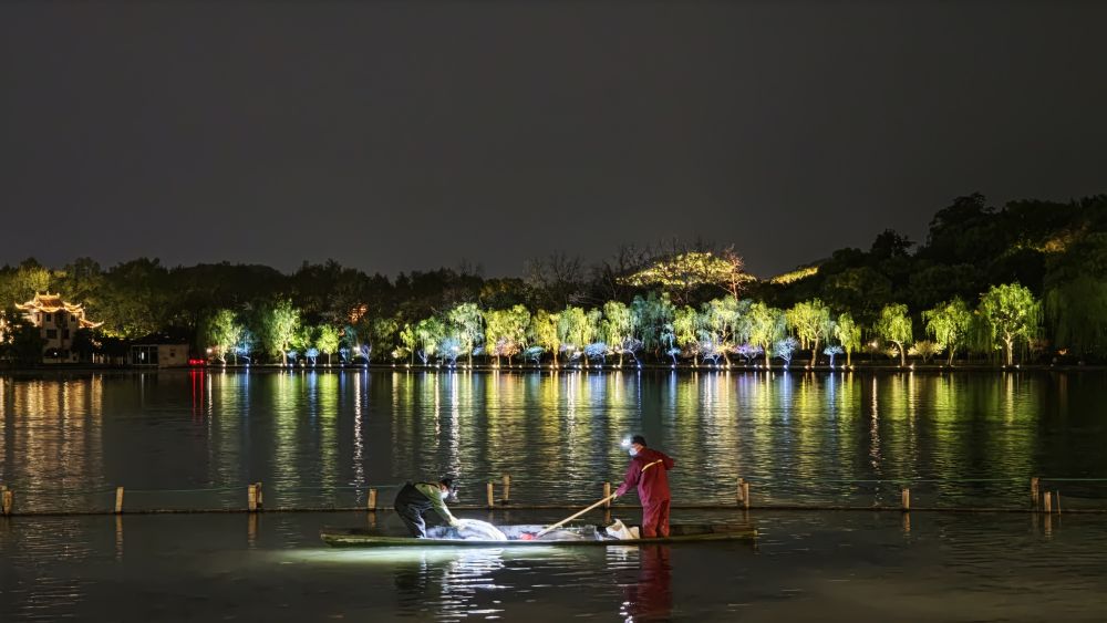 4月8日晚,工作人员在西湖清理荷塘。(受访者供图)