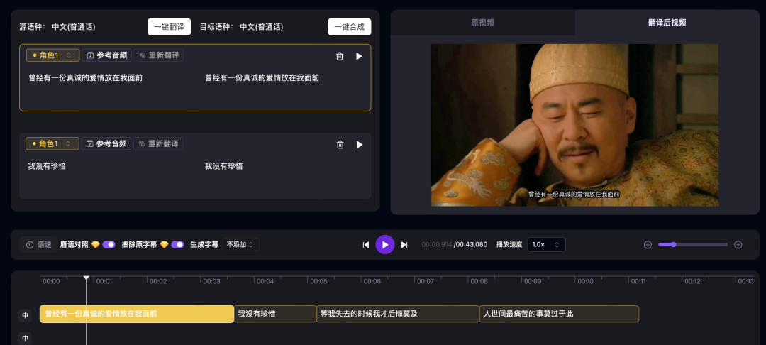 随后,南都记者按照平台客服指引,导入演员陈建斌在《甄嬛传》里的原声视频,一键克隆后,添加到“我的音色库”,在文本框中输入《大话西游》台词“曾经有一份真诚的爱情放在我面前,我没有珍惜……”,再点击“合成”,很快就生成了一条与陈建斌音色高度相似、且任意定制文本的音频,全程仅用了几分钟。