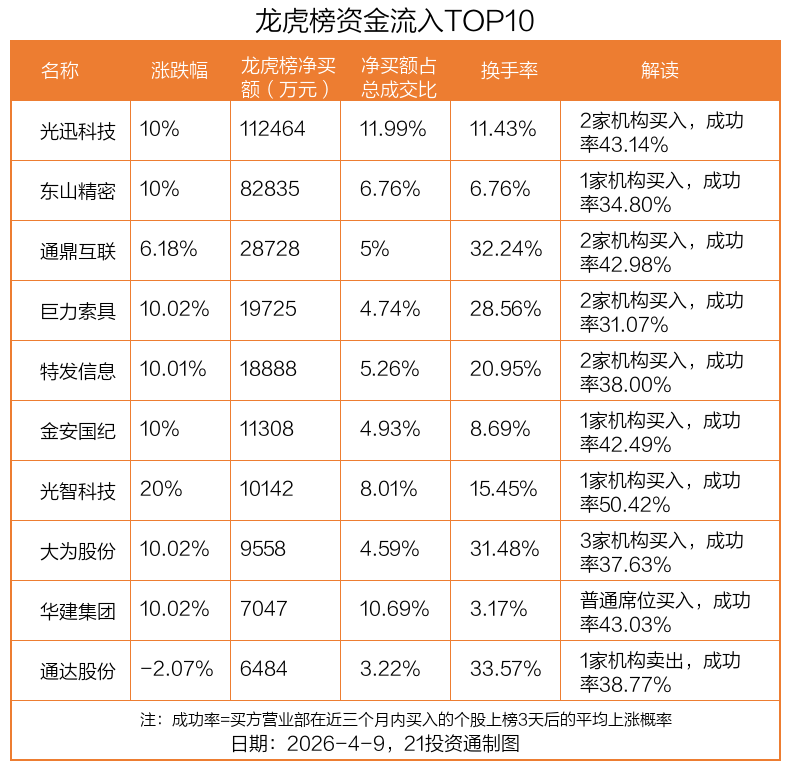 4月9日,上证指数下跌0.72%,深证成指下跌0.33%,创业板指下跌0.73%。盘后龙虎榜数据显示,共有44只个股因当日异动登上龙虎榜,资金净流入最多的是光迅科技(002281.SZ),达11.25亿元。